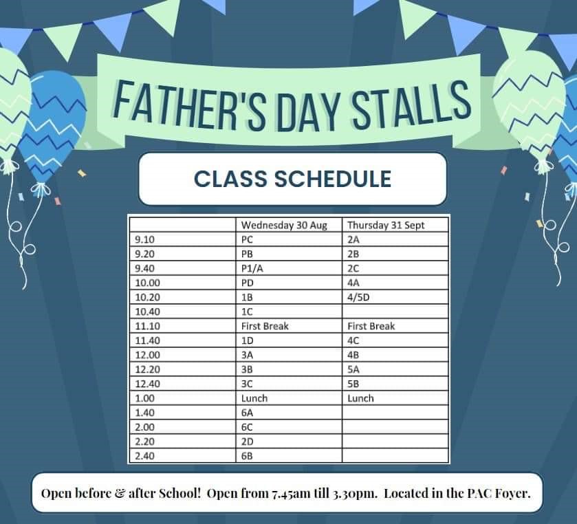 The P&C will be holding the Father’s Day Stall on Wednesday 30th and Thursday 31st August. Volunteers are still needed so please visit https://volunteersignup.org/9TD3D to sign up some of your time to help. Thank you to our wonderful P&C team and volunteers!